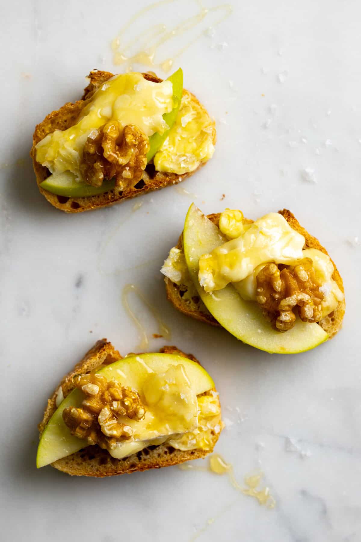 Alternatively, slice the baguette into ½" thick slices and top each with a hunk of brie cheese, an apple slice, a walnut and a drizzle of honey. In less than 10 minutes you'll have an appealing appetizer at the ready!